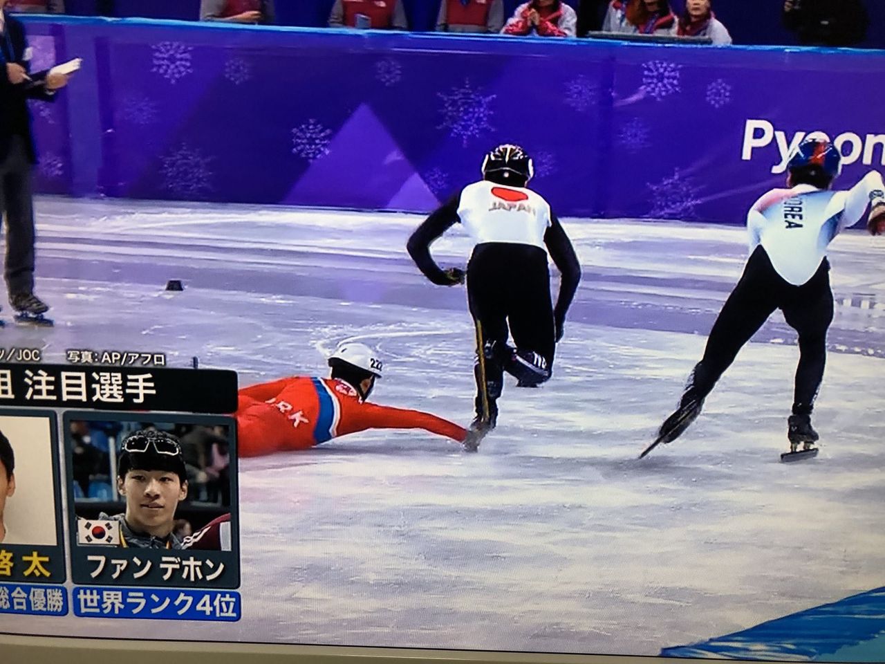 わざと転んで日本人選手を巻き込もうとしてるわ!
